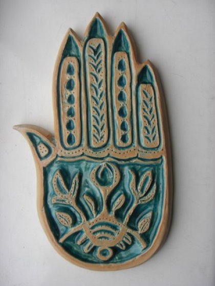 Ręcznie formowana i ręcznie rzeźbiona z kremowej gliny. Szkliwiona szkliwem turkusowym. Wymiary 18 x 11 cm. Do przylepienia na ścianę lub jako dekoracja leżąca. Niech szczęście przynosi i od złego chroni :)
