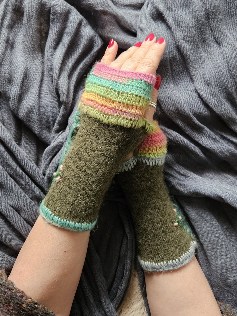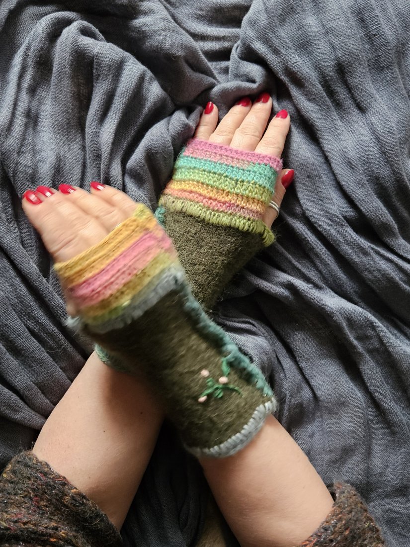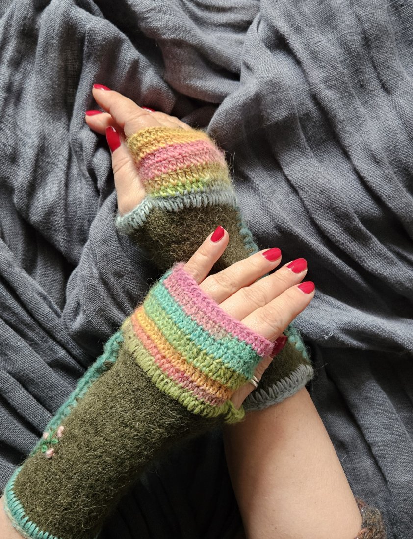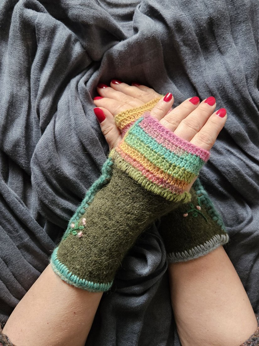 Mitenki, ocieplacze na dłonie, modny i wygodny dodatek do stylizacji, ręcznie szyte i dziergane nie tylko na jesień czy zimę, to również przedłużenie rękawów w chłodne letnie wieczory i ranki. Rozmiar M-L,