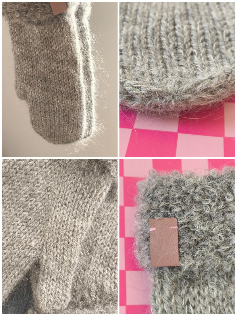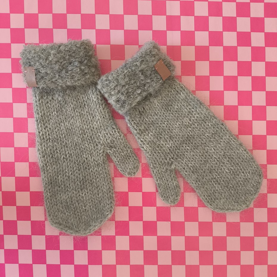 Ciepłe rękawiczki z wywijanym mankietem, wykonane ręcznie na drutach z połączenia 3 wełen w odcieniach szarości.