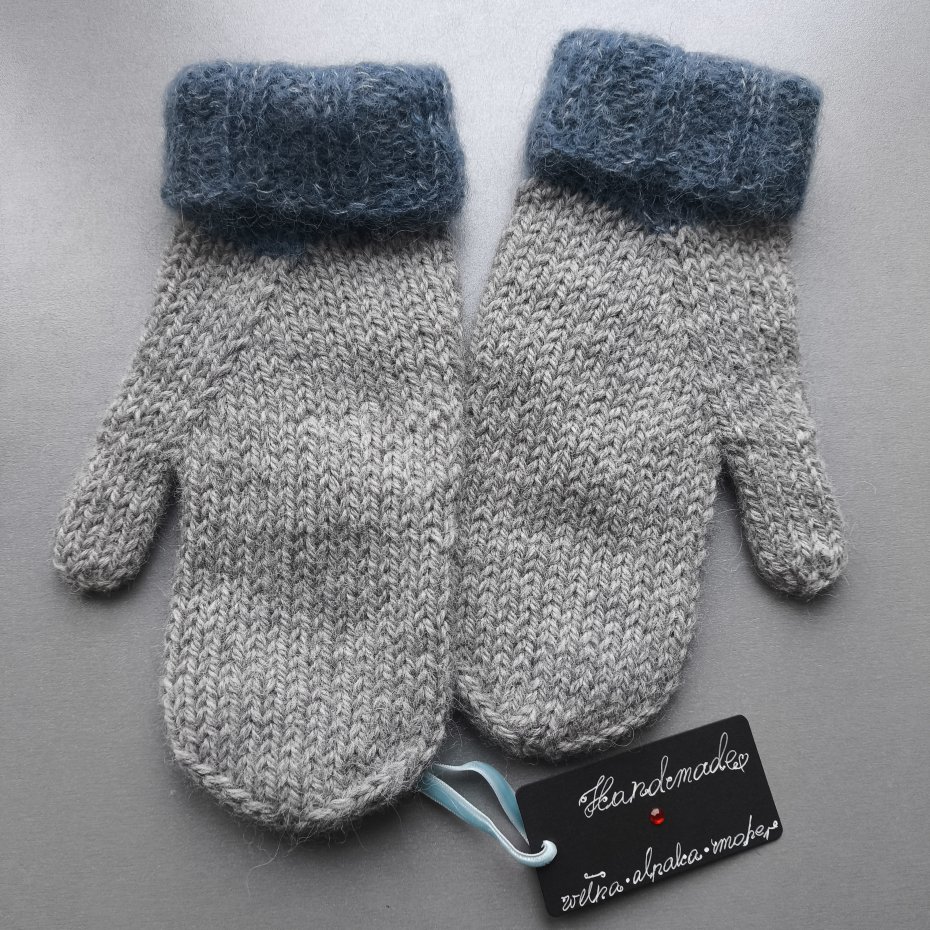 Szare rękawiczki z wywijanym mankietem w kolorze niebieskim wykonane ręcznie na drutach z połączenia różnych wełen.