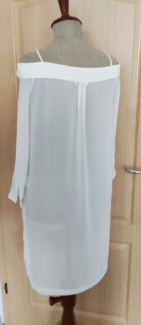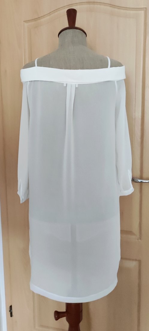 Oryginalna w kroju bluzka,delikatna i lejąca z dekoltem opadającym na ramiona, dłuższym tyłem i rękawem 3/4.