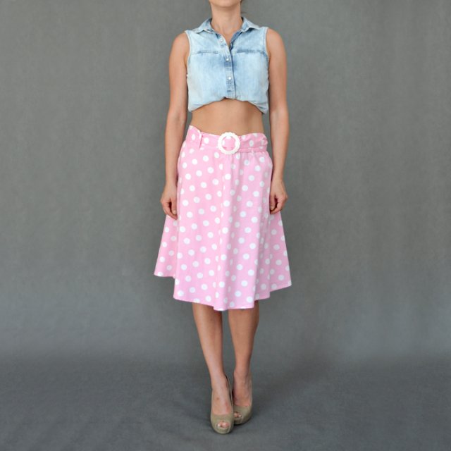 Superaśna różowa spódniczka w białe grochy. Dodatkowo pasek z klamerką w tym samym deseniu. Bez podszewki.