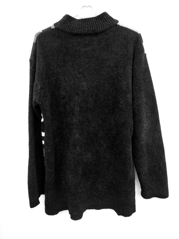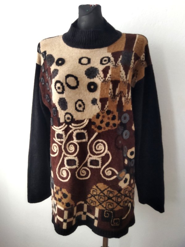 Ciekawy sweter akrylowo wełniany z wzorzystym przodem w kolorystyce odcieni brązów i beżu zdobiony haftem beżowa włóczka i szydełkowymi aplikacjami z szarej i brązowej włóczki, rękawy i tył w jednobarwnym czarnym kolorze. Wykończony ściągaczami