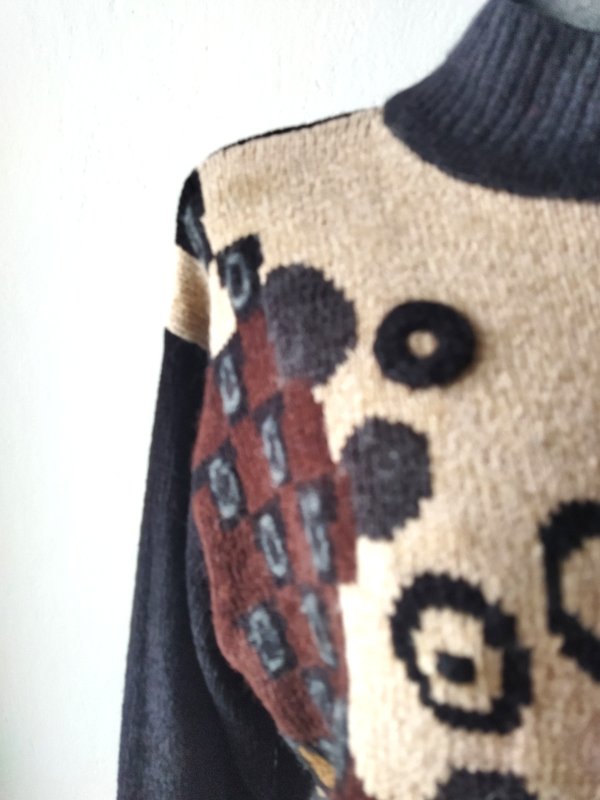 Ciekawy sweter akrylowo wełniany z wzorzystym przodem w kolorystyce odcieni brązów i beżu zdobiony haftem beżowa włóczka i szydełkowymi aplikacjami z szarej i brązowej włóczki, rękawy i tył w jednobarwnym czarnym kolorze. Wykończony ściągaczami