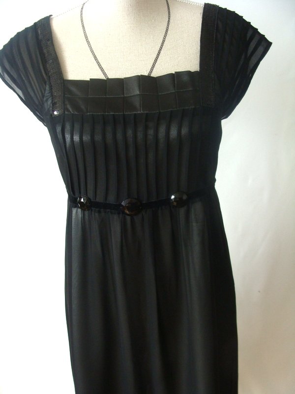 Sukienka z transparentnej tkaniny poliestrowej w czarnym kolorze, na podszewce w srebrnym kolorze nadającej sukience metaliczny efekt. Dekolt karo z przodu i z tyłu , obszyty cekinowa taśmą, z przodu z zakładkami w roli falbanki . Rękawki i środkowa część przodu zdobiona szczypankami, podkreślonymi aksamitną tasiemką z naszywanymi biżuteryjnymi guzikami, z tyłu wciągnięta w tunelik z możliwością wiązania i tym samym możliwością regulacji obwodu. U dołu doszywana szersza plisa z tkaniny z satynowym połyskiem. Całość bardzo dziewczęca i urocza.