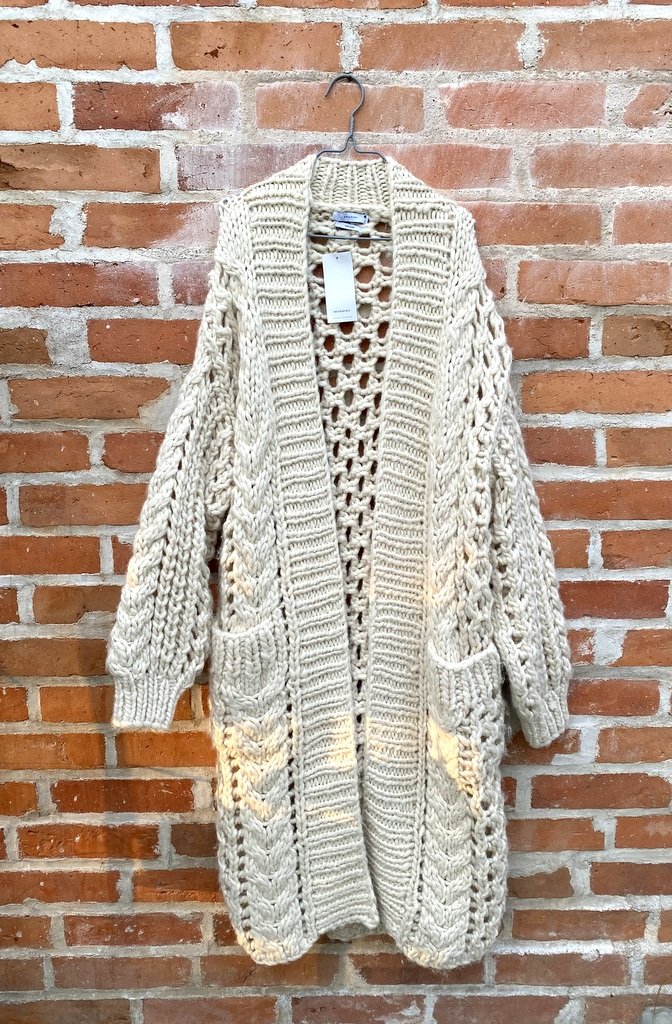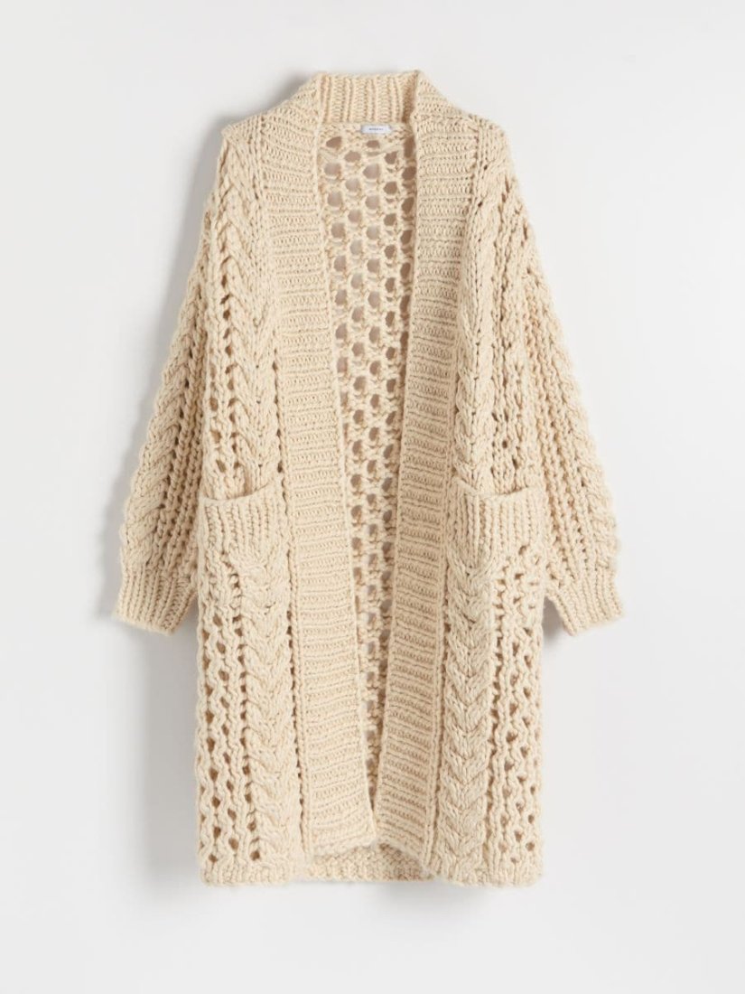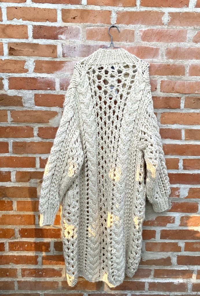 Kardigan o długiej, obszernej formie, ręcznie dziany z grubej i ciepłej dzianiny z dodatkiem wełny.