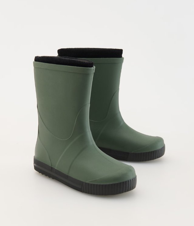 Klasyczne kalosze o prostym fasonie, wykonane z gumowanego materiału, w środku wyciągany ocieplacz. Nowe, z metką.