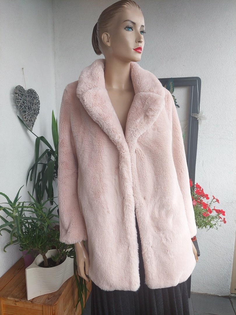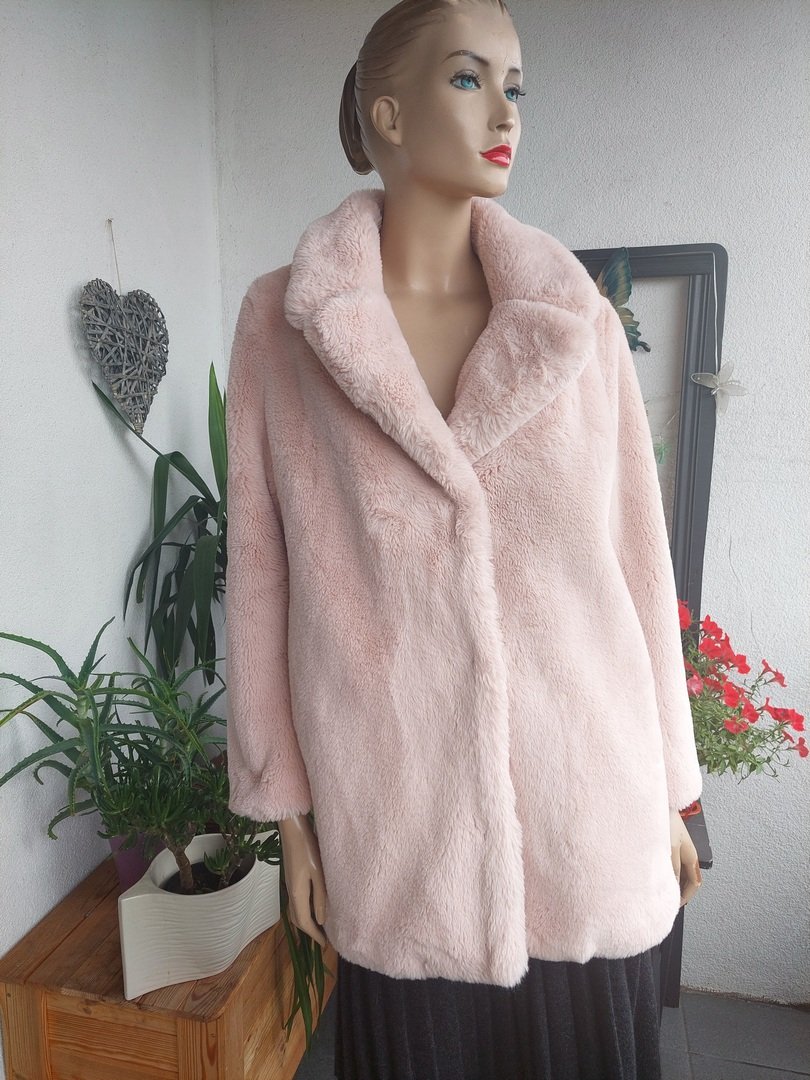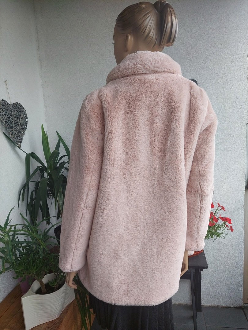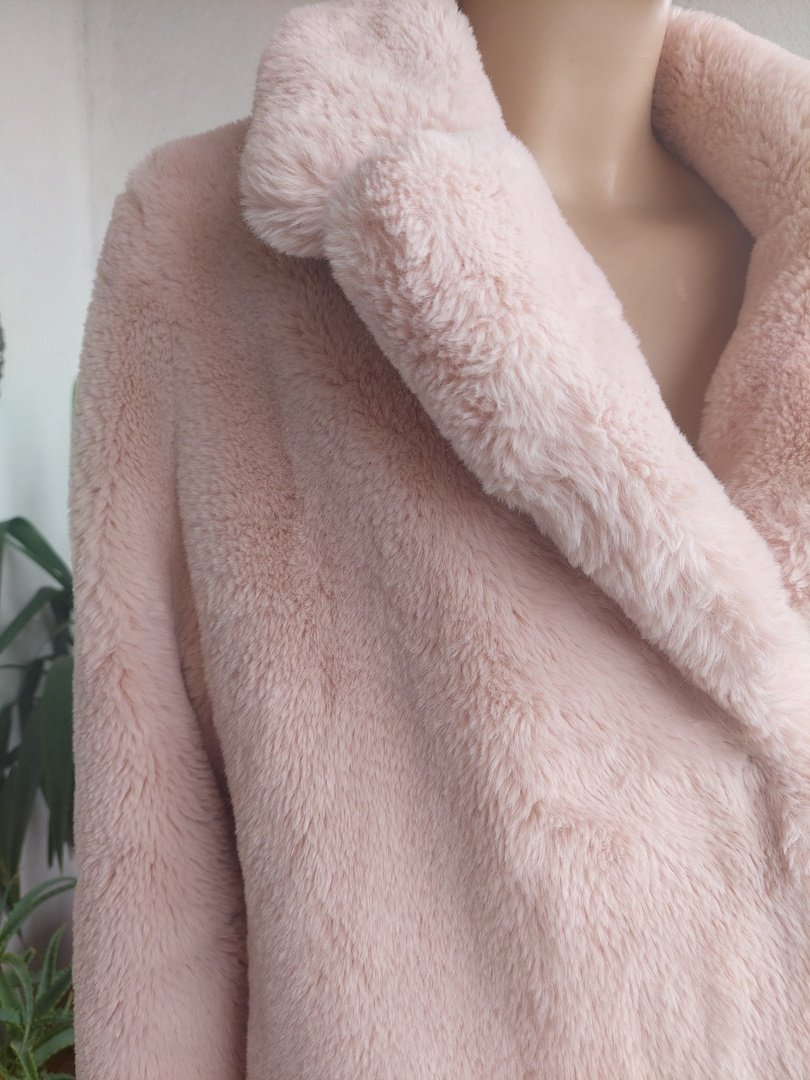 lekkie futerko marki reserved w kolorze pastelowy brudny róż. materiał 100% poliester. zapięcie na zatrzaski. rozmiar z metki L. stan bardzo dobry, niewielkie ślady normalnego użytkowania. proszę sprawdzić wymiary. na manekinie małe 38.