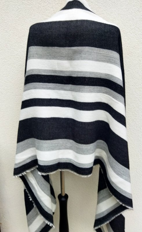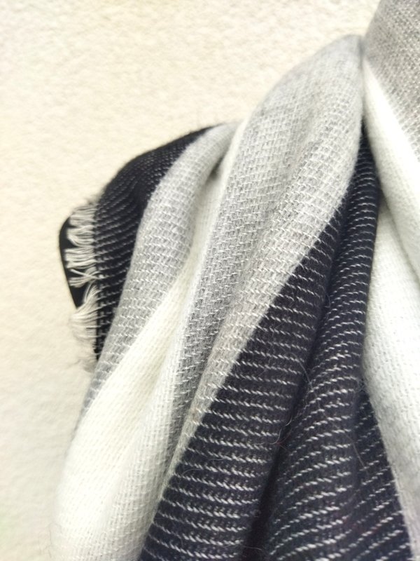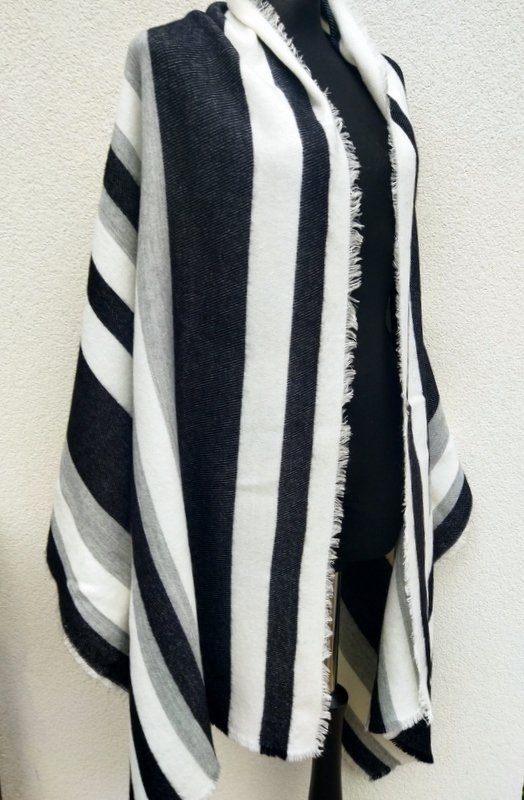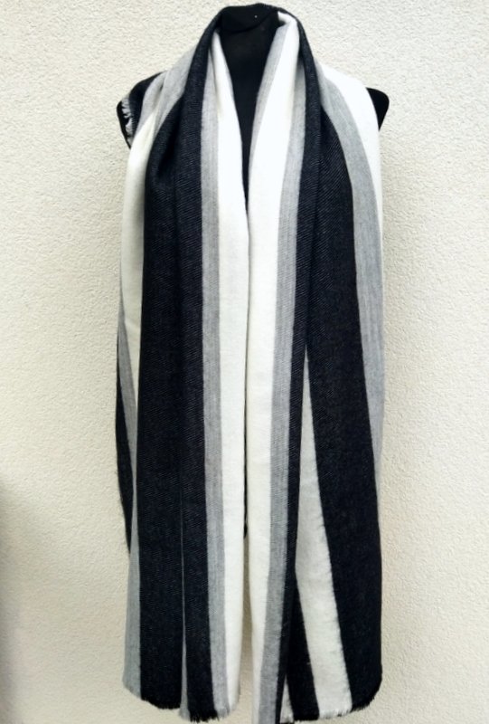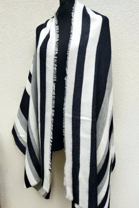 Olbrzymi , miły , mięciutki puszysty szal w paski w kolorystyce bieli, szarości i czerni. Wykończony króciutkimi frędzelkami wyciąganymi z tkaniny.