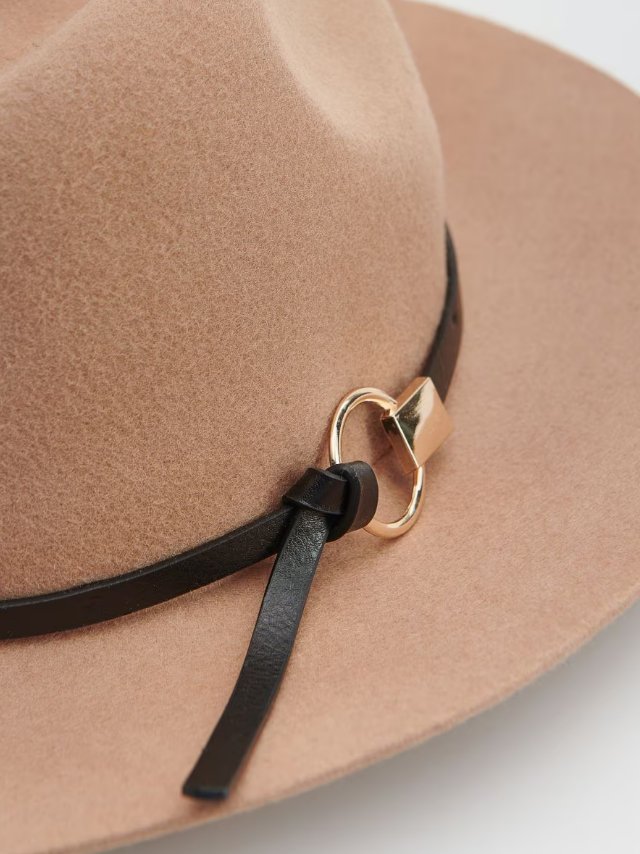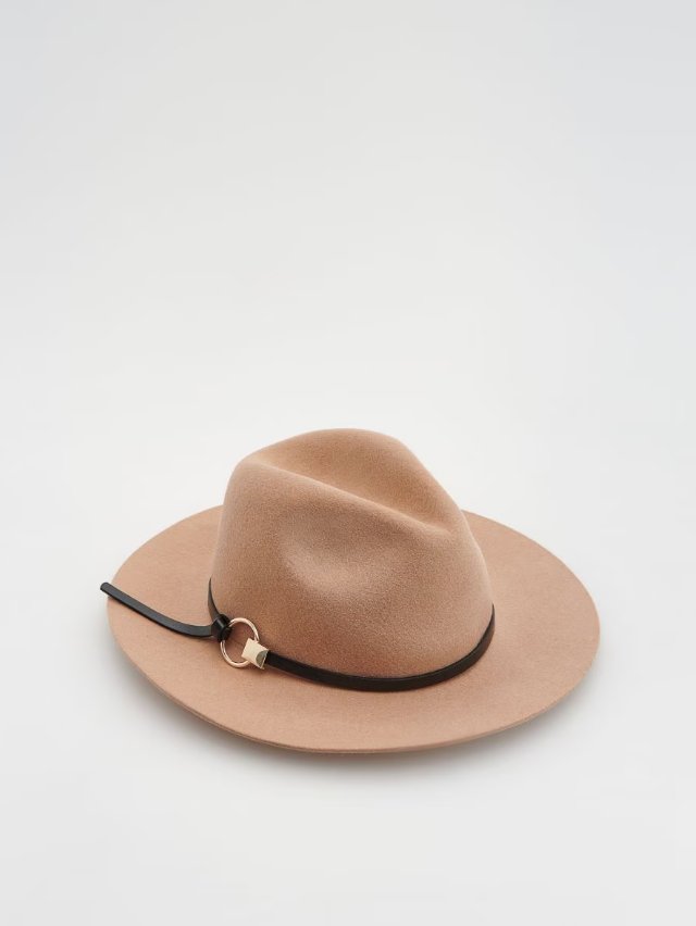 Kapelusz o klasycznym kształcie, wykonany z wełny. Nowy, z metką.