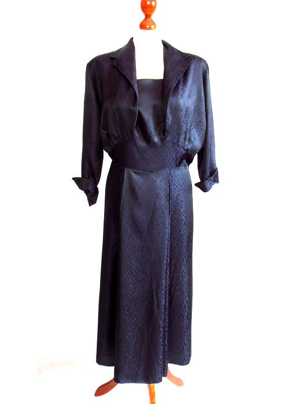 Sukienka retro uszyta z pięknej tkaniny- atłas tkany w kropeczkowy wzór-z połyskiem.Fioletowo-granatowy.