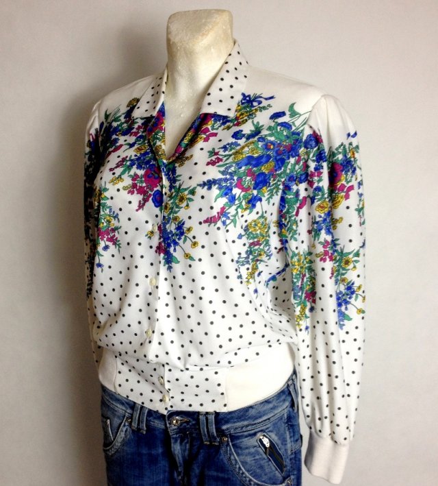 Świetna bluzka w klimacie retro fason ala bomber- bufiaste ramiona, biała w groszki i kolorowe kwiaty, zapinana na guziki, rękawy i dół wykończone ściągaczem.