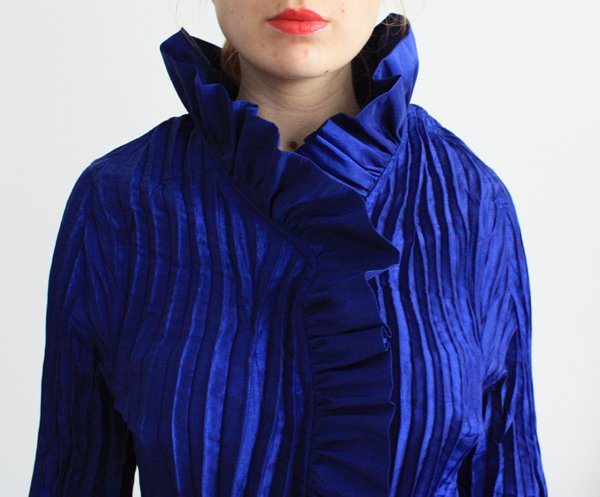 Luksusowa, unikatowa bluzka w kolorze nasyconego kobaltu. Plisowana, elastyczna struktura i plastyczny, ale dość sztywny dekolt trzymający fason, który można układać na różne sposobów (w tym jak kryzę). Zapięcie na ukryte zatrzaski. Można nosić z paskiem lub bez (ukryte, cieniutkie szlufki).