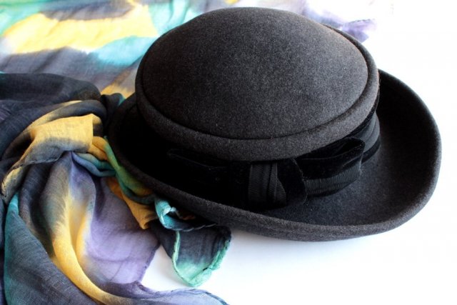 Kapelusz vintage z wełny o klasycznym fasonie, ozdobiony subtelnym detalem. Z tyłu rondo jest węższe.