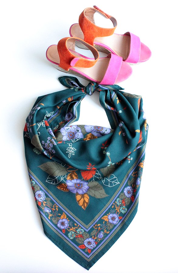 Duża chusta w kwiatowe wzory w stylu retro. Tło w odcieniu ciemnogranatowym przechodzącym w zieleń, kwiaty fioletowe, pomarańczowe i rude. Materiał to prawdopodobnie wiskoza.