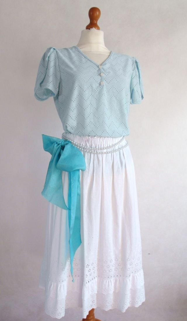kolor - błękit z kroplą mięty.ażurowy wzór, przy dekolcie guziki. rękawy w formie dużych płatków kwiatowych, bardzo kobieca.