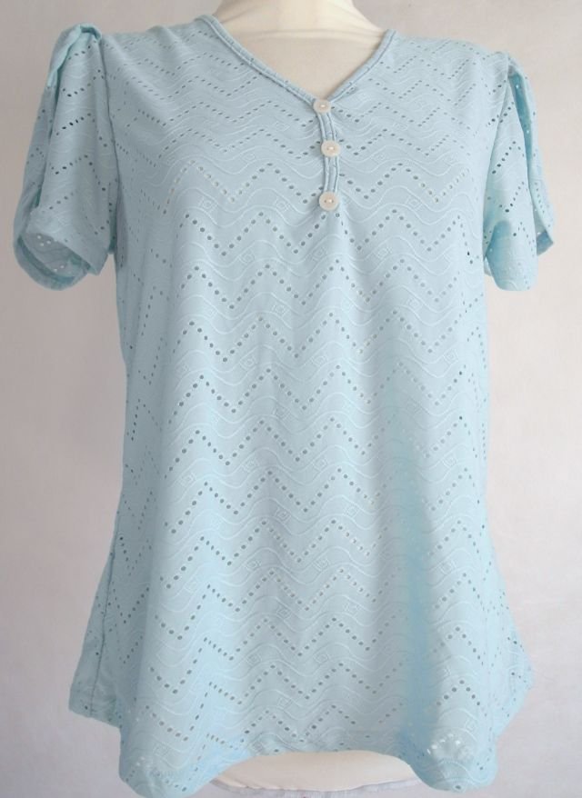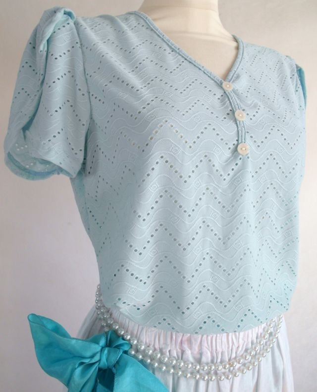 kolor - błękit z kroplą mięty.ażurowy wzór, przy dekolcie guziki. rękawy w formie dużych płatków kwiatowych, bardzo kobieca.