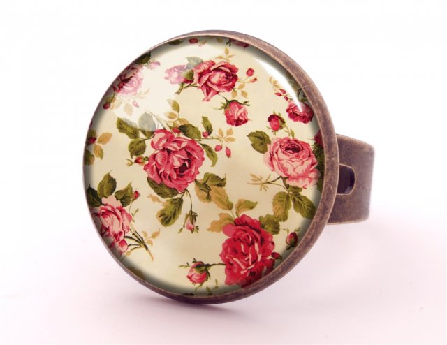 Ręcznie robiony regulowany pierścionek z wysokiej jakości grafiką pokrytą wypukłym, powiększającym szkiełkiem.