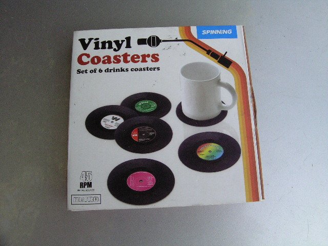Zestaw sześciu vinylowych podstawek w oryginalnym pudełeczku. / Spinnig Hat Retro Vinyl Coasters New - SPINNING/; Zabawne,dowcipne,użytkowe,niespotykane...