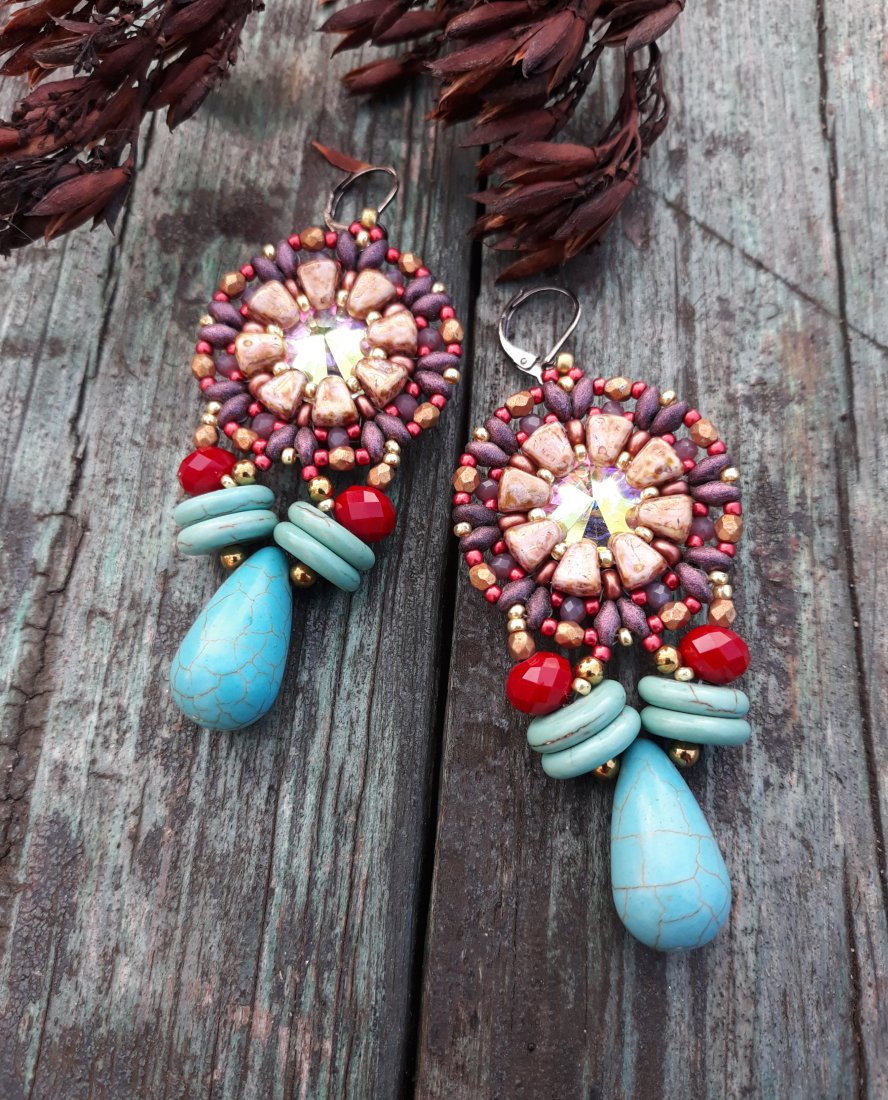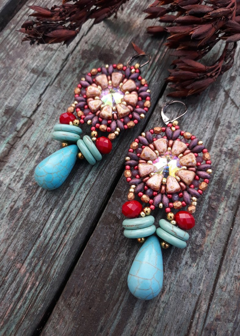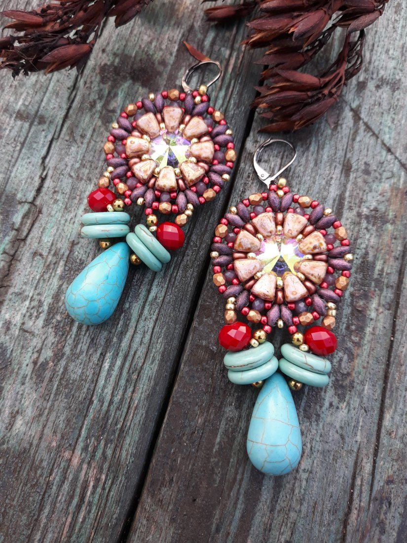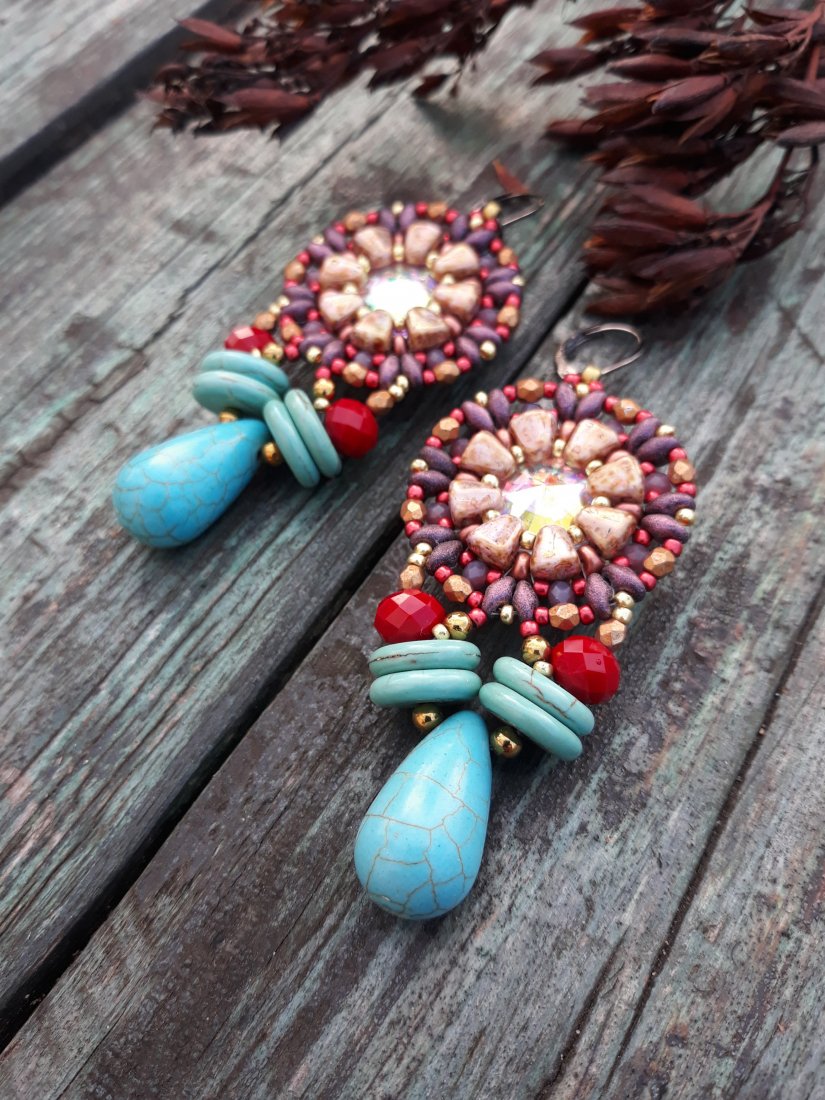 ,,retro we fiolecie z turkusem,, to bardzo kobiece kolczyki wykonane z turkusu, hematytu i szklanych koralików i kryształków w różnych odcieniach fioletu, złota i czerwieni. Kolczyki zawieszone są na ozdobnych biglach typu angielskiego w kolorze antracytowym.