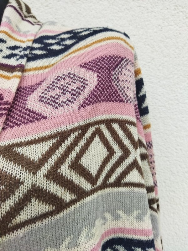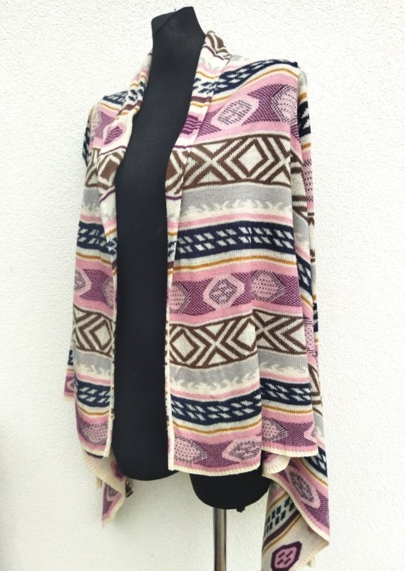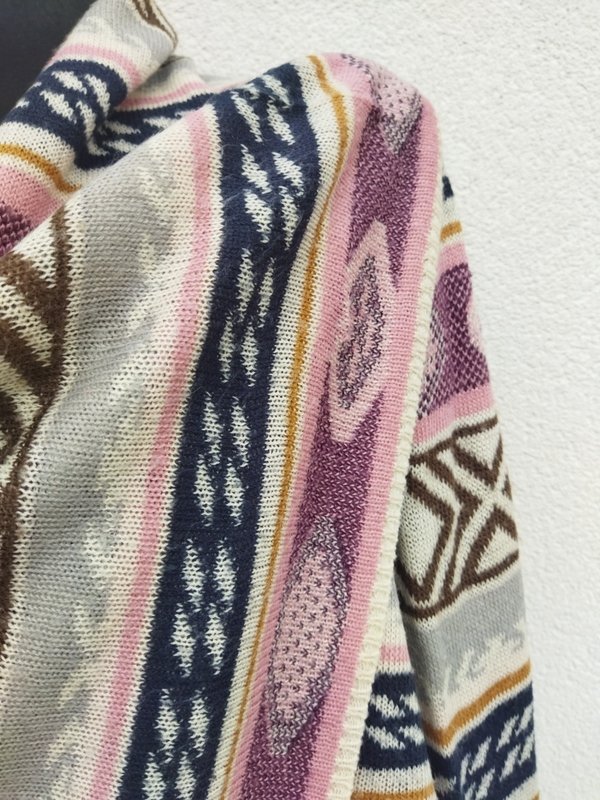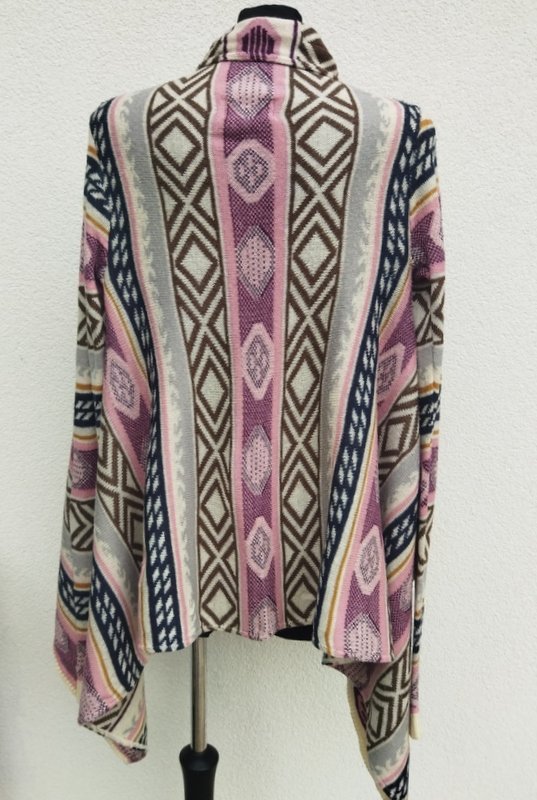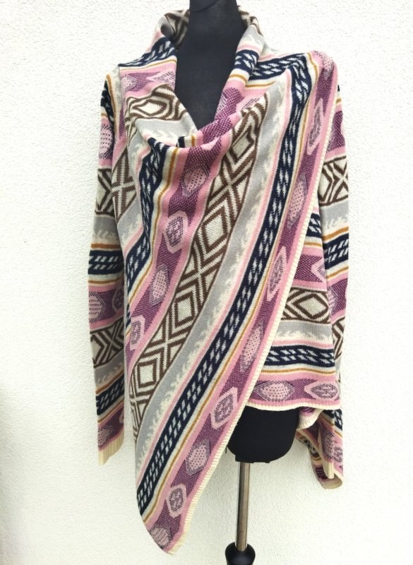 Wzorzysty żakardowy akrylowy sweter w kolorystyce złamanej bieli, brązu, miętowej i zgniłej zieleni, weneckiego różu, oberżyny i czerni z połami przodu zachodzącymi na siebie aż do przeciwległego boku - opuszczone swobodnie w dół nadają mu asymetrycznego wyglądu. Bezszwowy w kształcie prostokąta z wszywanymi rękawami. Fason otwarty . Podatny , miękki i miły.