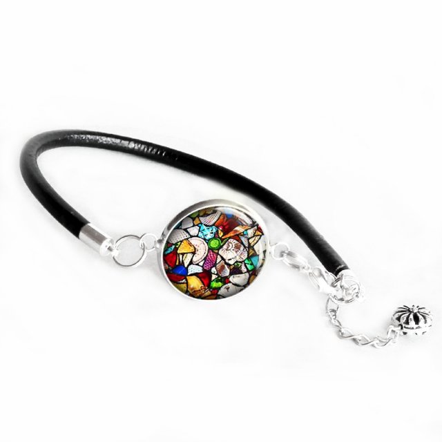 Bransoletka z unikatową grafiką artystyczną umieszczoną pod wypukłym szkłem tzw. kaboszonem, dającym efekt trójwymiarowości i oprawioną w hipoalergiczną bazę w kolorze srebrnym. Oczko z grafiką przymocowane do czarnego rzemienia ze skóry naturalnej. Zapięcie posrebrzane, hipoalergiczne. Unikatowe szklane kaboszony z grafiką wykonane są ręcznie według mojego projektu, z dbałością o każdy detal. Biżuteria nie zawiera niklu i ołowiu.