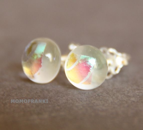Szklane kolczyki na srebrnych sztyftach. Własnego wypału, wykonane metodą fusingu. Wielkość ok 7mm średnicy. W zależności od kąta nachylenia, łagodnie zmieniają barwę i jej intensywność. Swą wyjątkową naturę zawdzięczają wtopionym tlenkom metali - złota, srebra, aluminium, chromu, tytanu, cyrkonu, magnezu i krzemu. Spód transparentny. Sztyfty i baranki srebro próby 925. Polecam gorąco :)
