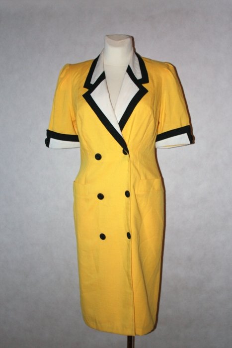 bardzo oryginalna sukienka vintage z lat 80-tych, piękny słoneczny kolor, krótki rękawek z wywiniętymi biało-czarnymi mankietami, w takim samym kolorze kołnierzyk, w ramionach poduszki, zapinana na dwurzędowe guziki, z przodu imitacja kieszeni, na podszewce