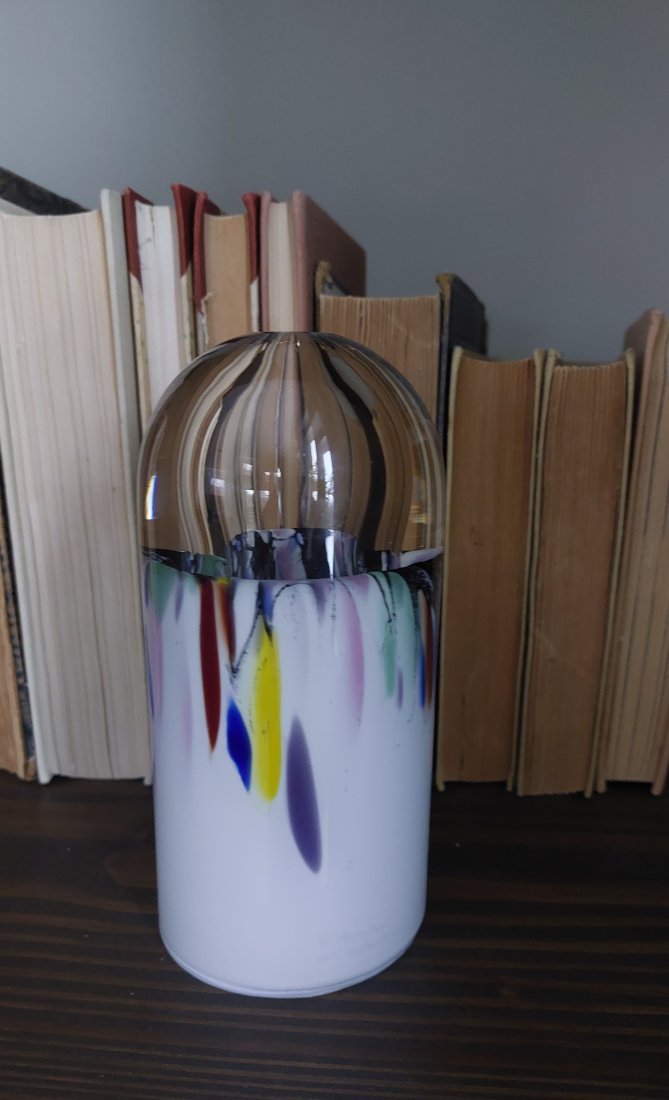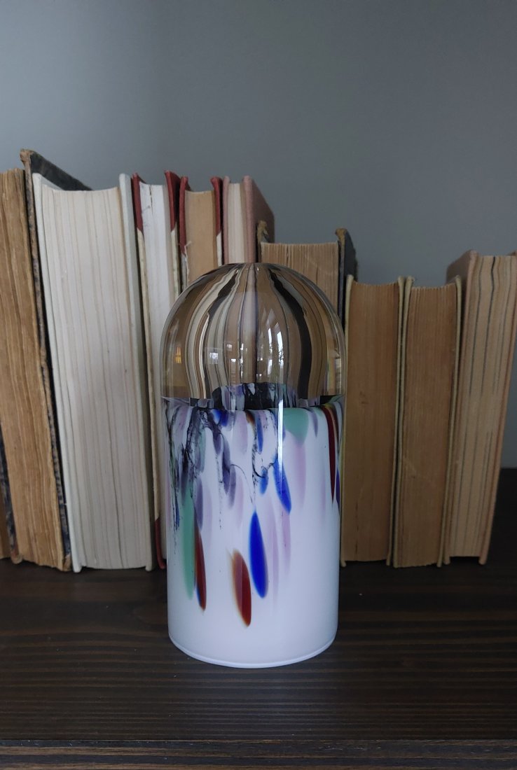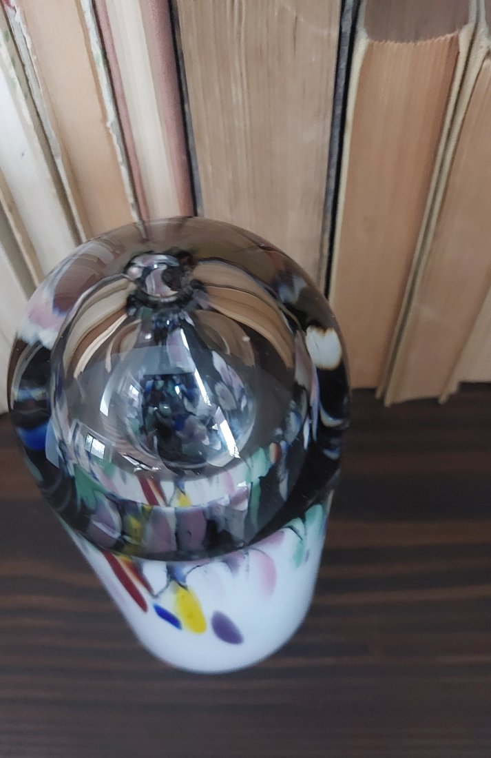 Wazon, dekoracja ze szkła artystycznego z lat 80-tych z kolekcji Richartz Art , sygnowana. Szkło ozdobione kolorowymi, abstrakcyjnymi smugami.