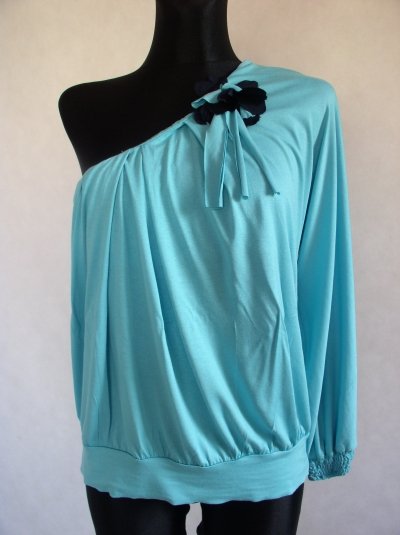Bluzka włoska firmy RINASCIMENTO.Rozmiar M.Materiał wiskoza + bawełna.Bez jednego rękawa.Dekolt idzie na ukos.Drugi rękaw długi ,kimono,zakończony ,ściągaczem z 5 gumek.Dekolt ozdobiony kwiatem z materiału.Góra z podwójnego materiału.Dół marszczony do plisy.Stan bardzo dobry.Długość 65 cm.