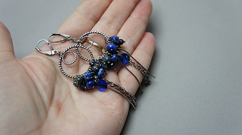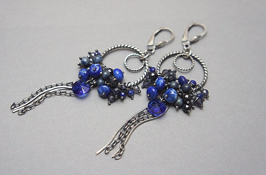 Kolczyki wykonane własnoręcznie od podstaw ze srebra [pr. 925] w połączeniu z fasetowanymi kuleczkami szafirów [4mm], kryształkami [8mm], kuleczkami jaspisów cesarskich [4mm], fasetowanymi kuleczkami lapisów lazuli [2mm], fasetowanymi iolitami [3mm], oponkami lapisów lazuli [6mm]. Całość zawieszona na rolowanych obręczach [24mm]. Srebro ręcznie oksydowane i przecierane. Całkowita długość kolczyków: 9 cm. Biżuteria ozdobnie zapakowana.