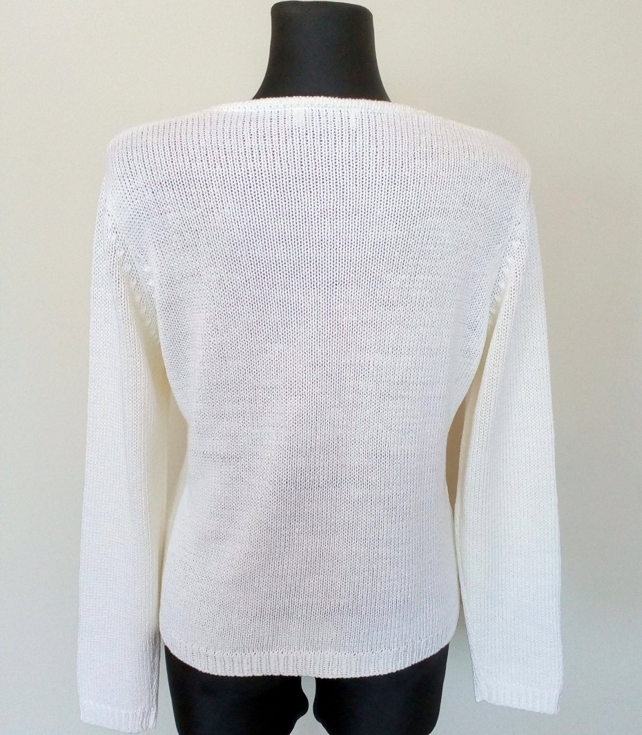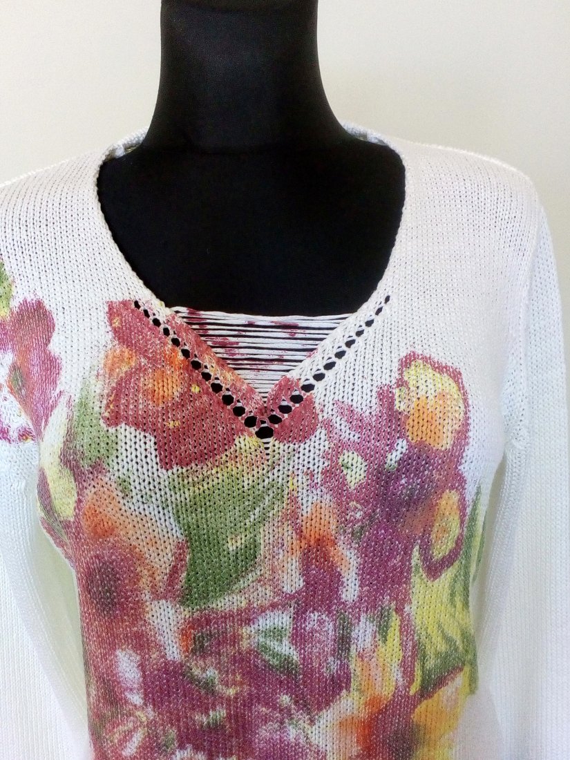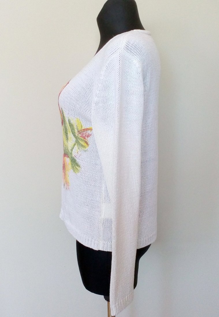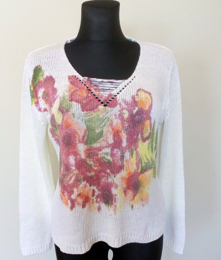 Biały, acrylowy sweter z kolorowym, kwiatowym nadrukiem na przodzie, dekolt w szpic, wąski ściągacz u dołu swetra i przy rękawach