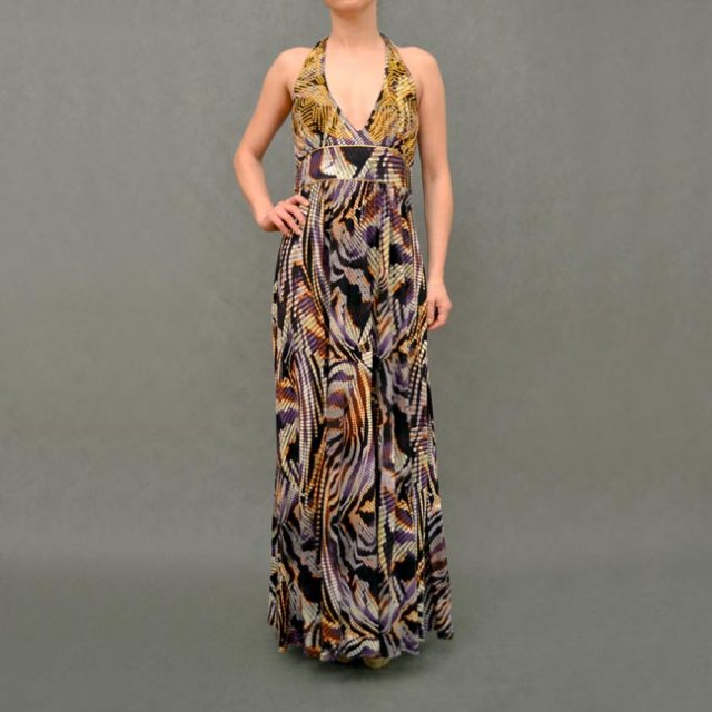Długa sukienka od RIVER ISLAND. Wiązana na szyi, góra ozdobiona złotymi dżetami. Z boku zapinana na zamek.