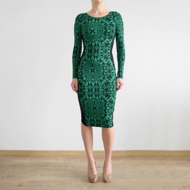 Cudna, dopasowana sukienka w zielonym kolorze. W czarny geometryczny wzór. Z boku wszyte czarne pasy, co daje mega wyszczuplający efekt. Polecam.
