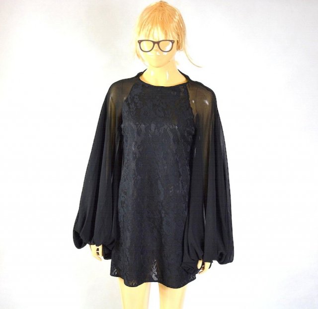 legancka sukienka/tunika marki River Island o poszerzanym kroju, przód i tył koronkowy na podszewce, na uwagę zasługują bardzo szerokie rękawy ( ok 53 cm ) wykonane z transparentnej tkaniny wykończone gumkowym ściągaczem, sukienka z tyłu ma suwak.