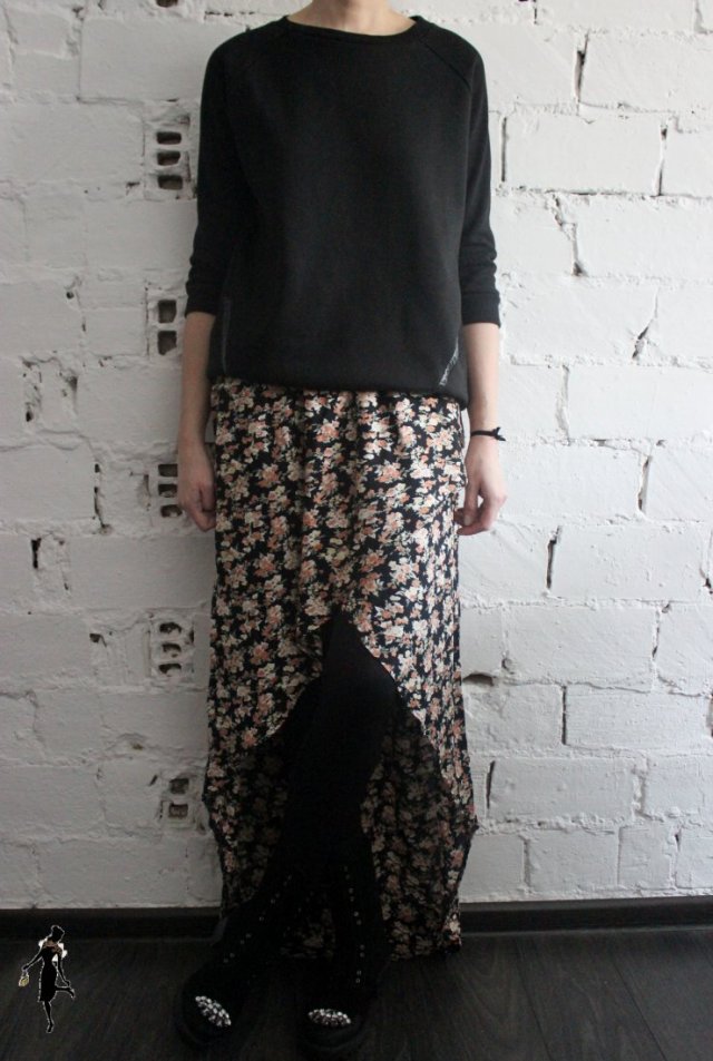 Spódnica asymetryczna w kwiaty. Firma River Island. Rozmiar z metki 46/XXXL. Wymiary: obwód pasa-55cmx2 (regulacja gumką), obwód bioder-70cmx2, długość przodu spódnicy-50cm, długość tyłu spódnicy-108cm. Skład materiału: 100% wiskoza.