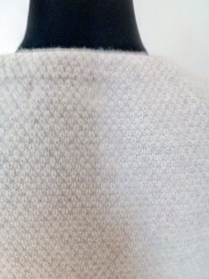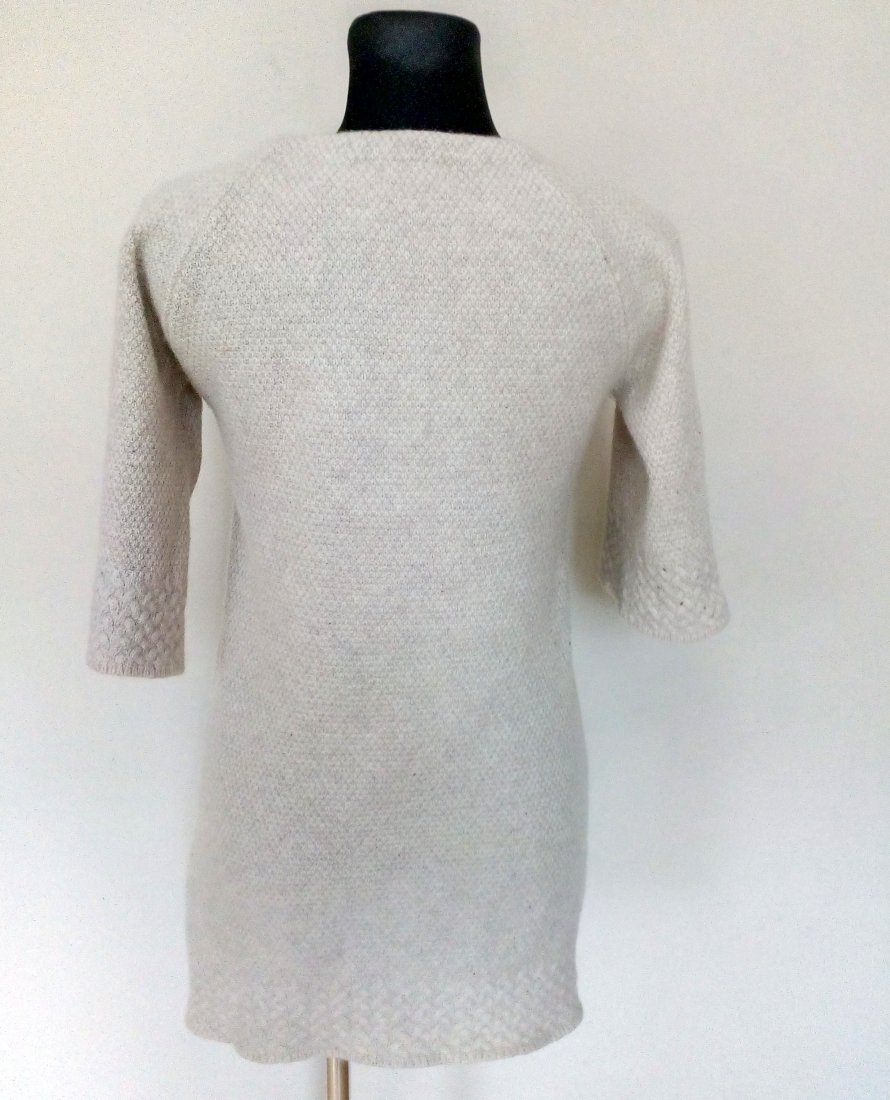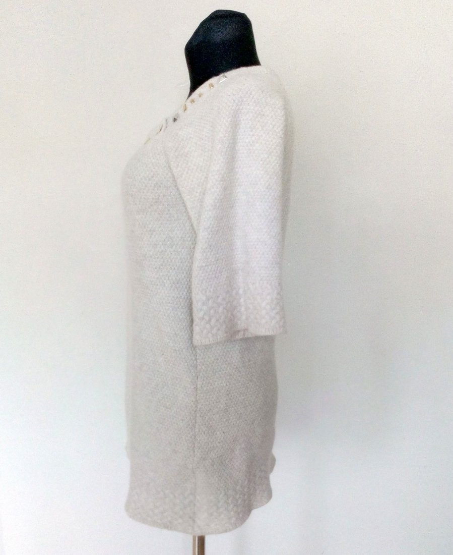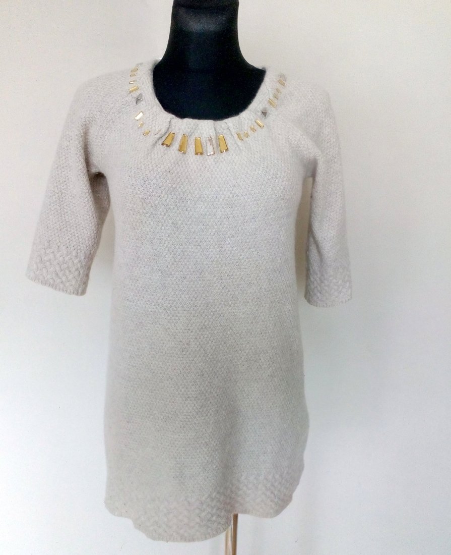 bezowy sweter z wełny jagnięcej, ze zdobionym dekoltem, rękaw raglanowy o długości za łokieć