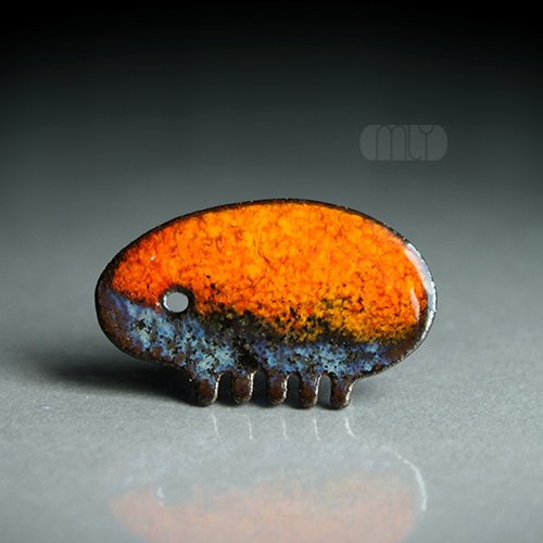 Oryginalna ceramiczna broszka inspirowana motywami biologicznymi, wykonana z jasnobeżowej gliny kamionkowej, szkliwiona błyszczącym pomaranczowo szarym szkliwem, zapięcie w kolorze srebrnym. Długość ok. 3,7cm. Polecam