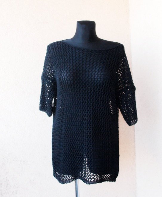 Wdzianko, które wygląda ja zrobione szydełkiem, ale nie wiem czy jest to rękodzieło. Brak jakichkolwiek metek. Na manekinie o rozmiarze 38, i jest to chyba rozmiar rzeczywisty. Niewielkie ślady użytkowania (czerń być może już nie taka intensywna).