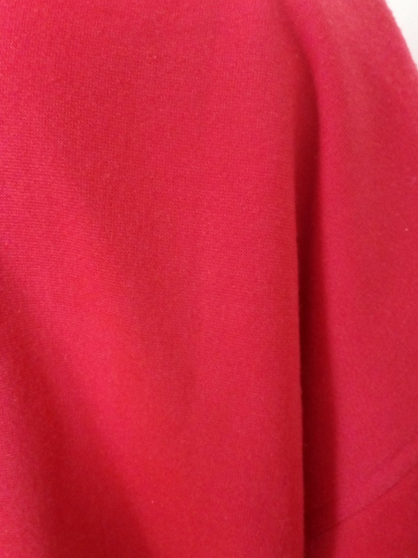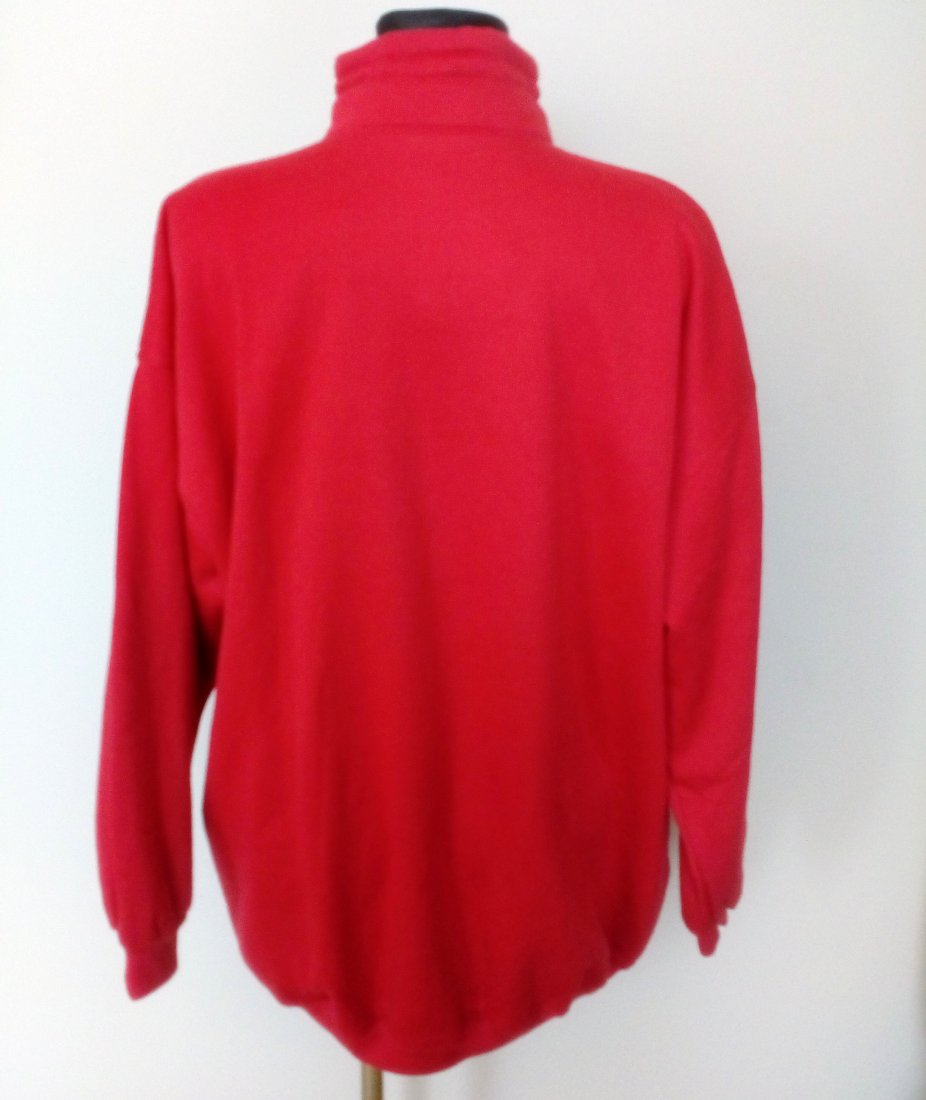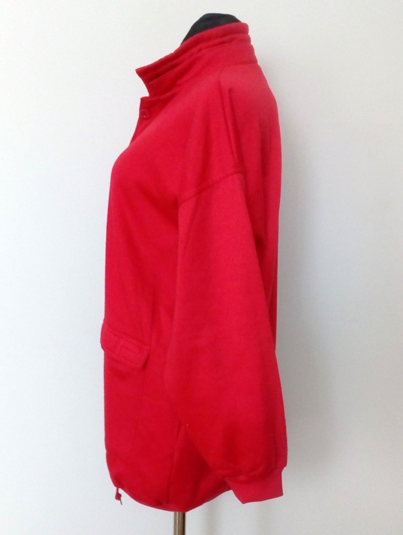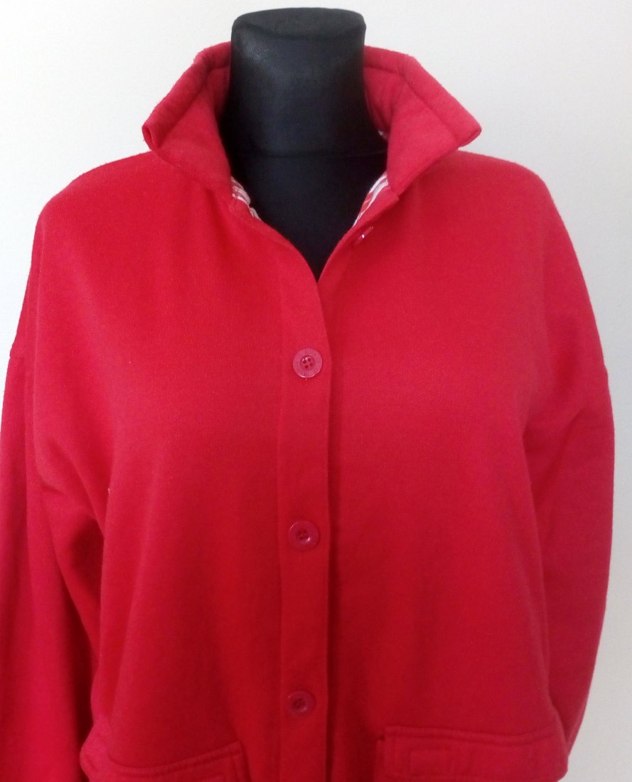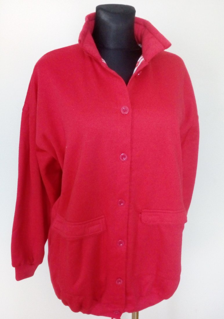 Ocieplana, dzianinowa bluza w żywym, czerwonym kolorze, zapinana na guziki, z przodu duże, naszywane kieszenie z patkami zapinanymi na rzepy, w szach bocznych wpuszczane kieszenie, u dołu bluzy ściągacz z wciągniętym sznurkiem, rękawy obniżane ze ściągaczem, wokół szyi podwójna stójka, od środka bawełniana podszewka w biało-czerwone paski