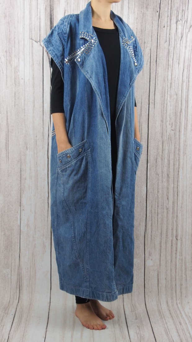 Jeansowa narzuta w rockowym klimacie. Zdobiona dużą ilością kamyków wyglądających jak cyrkonie. Na ozdobnych dżetach napis LES TERRIBLES. Na piersi kieszonki ozdobne (te na zamek), w pasie kieszonki prawdziwe na guziki, tylne kieszonki na zamek także są prawdziwe.