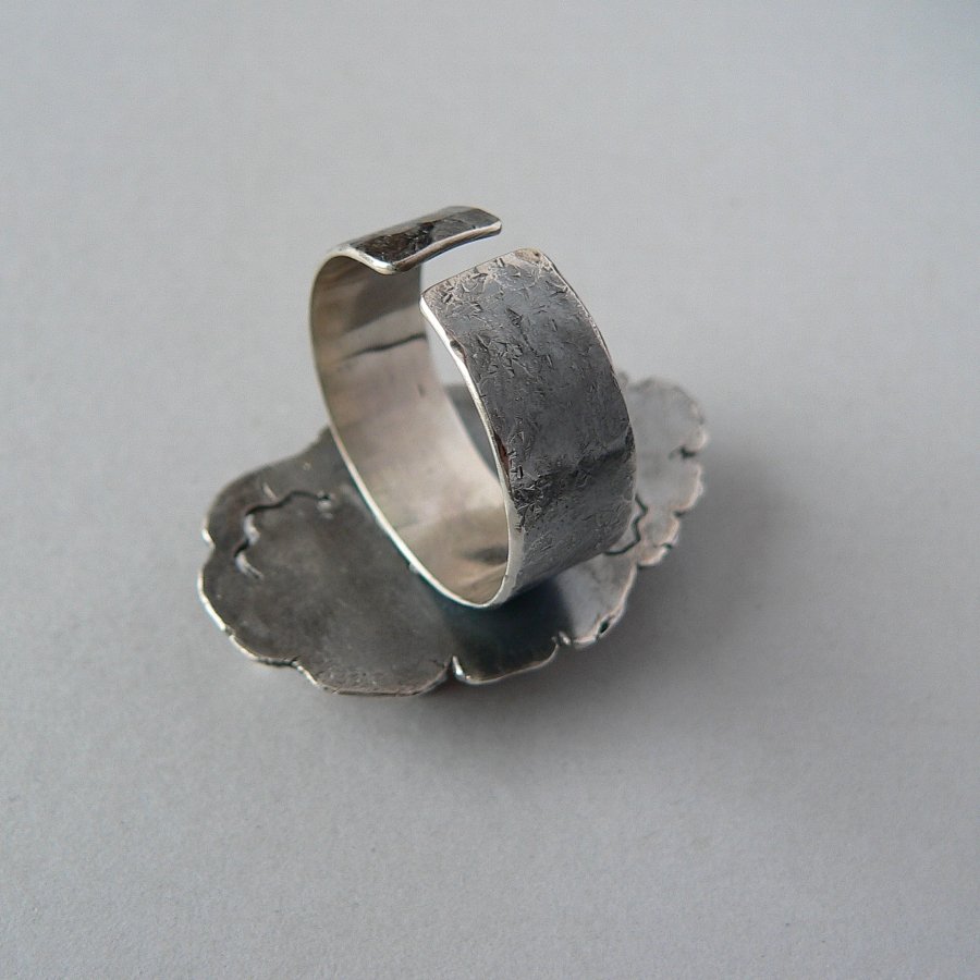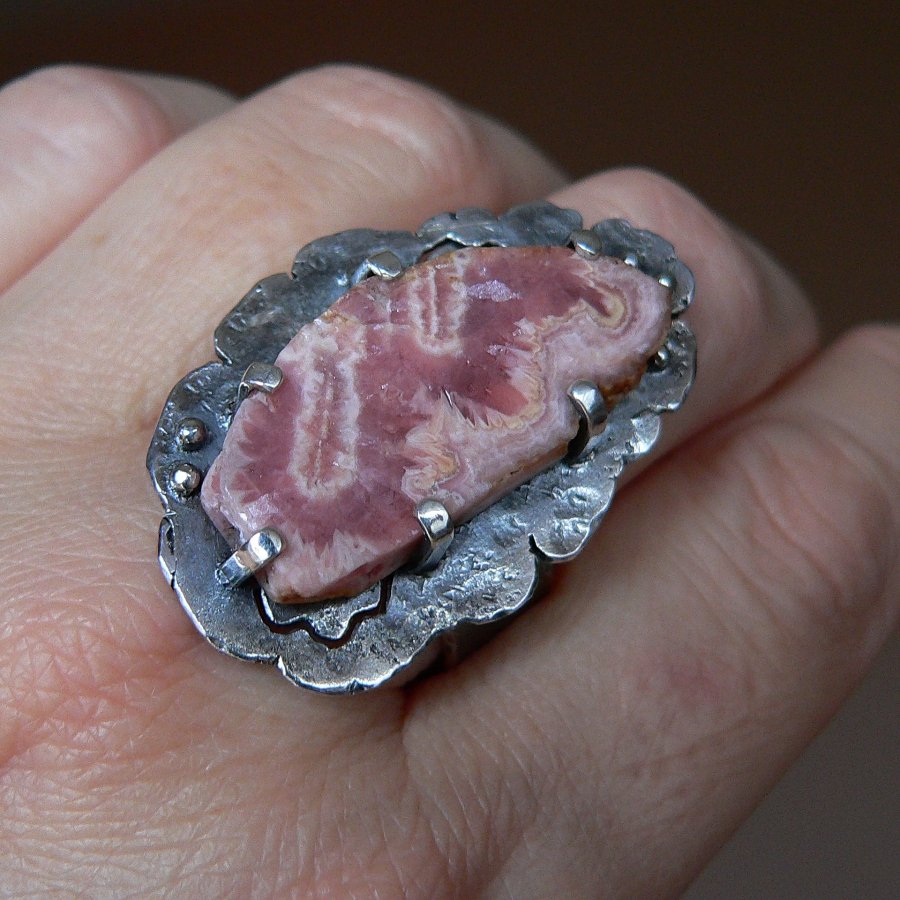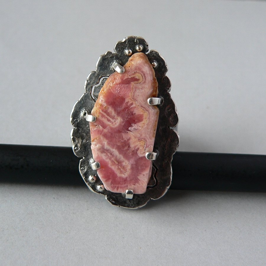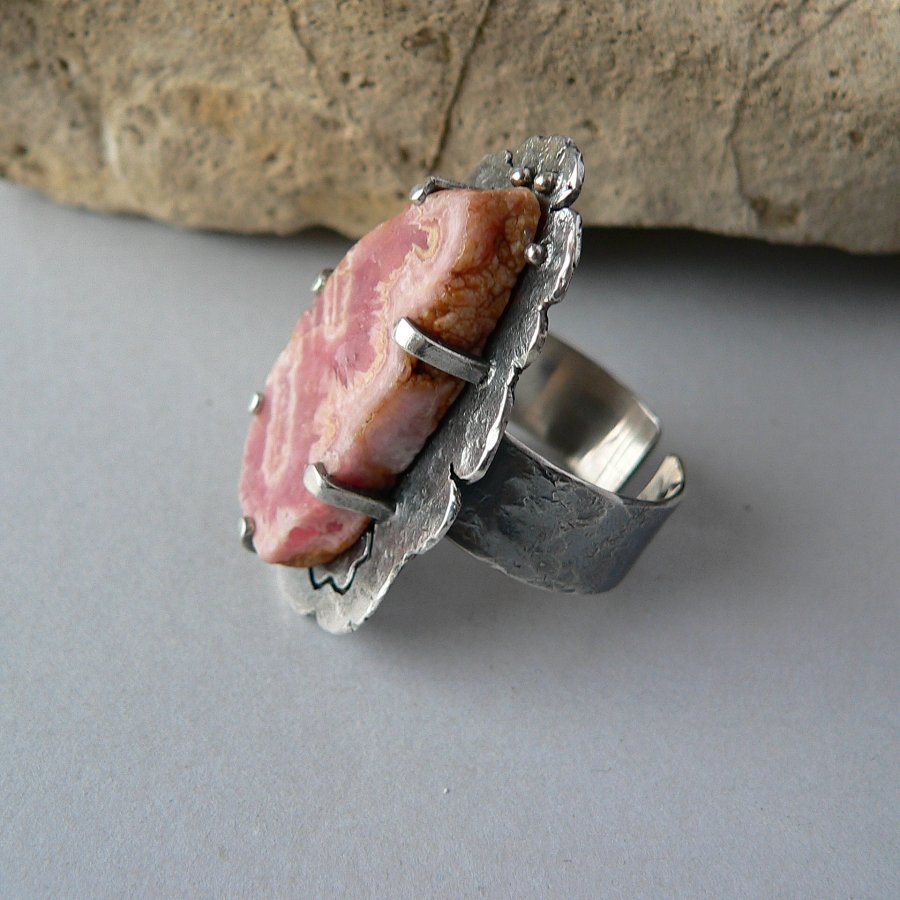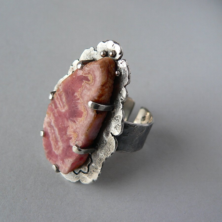 Surowy pierścionek wykonany ze srebra i matowego plastra rodochrozytu w odcieniu brudnego różu. Srebro formowane ogniem, fakturowane, oksydowane i polerowane. Wymiary kamienia 15/3,2 mm , wymiary frontu-plastra surowego srebra 4/2,5 cm Rozmiar regulowany, przy zakupie proszę o podanie rozmiaru, ustawię obrączkę.