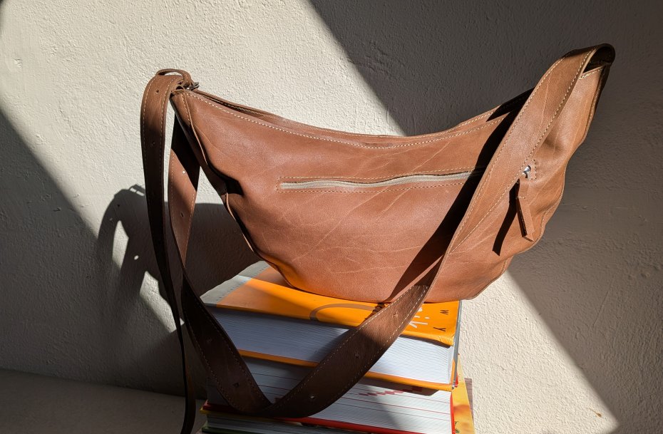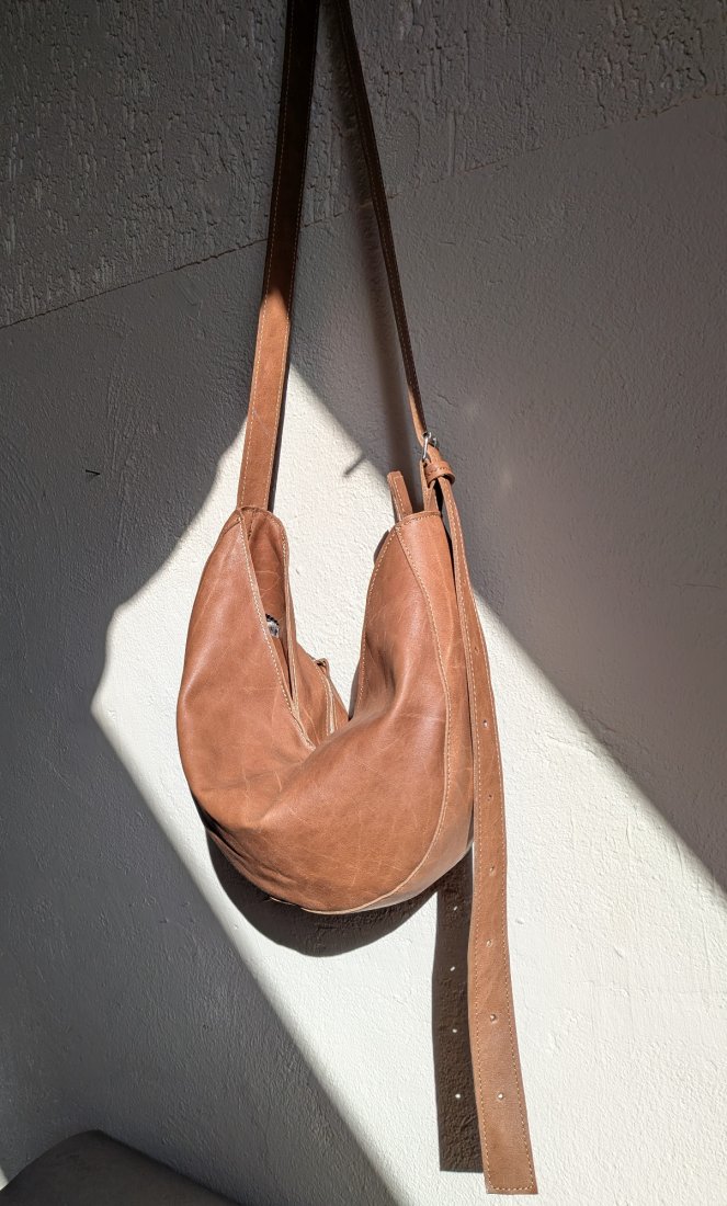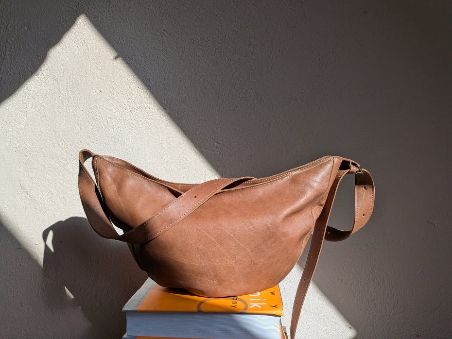 Średniej wielkości torebka typu rogalik. Uszyta z miękkiej mięsistej skóry naturalnej.bkolr ja my brąz, ciemny beż, camel, kolor płaszczy Max mara.
