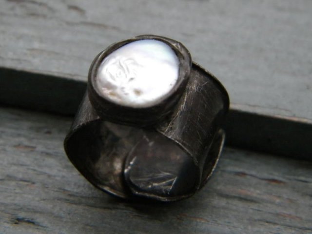 Pierścionek. Biała perła w ocynowanej miedzi.obraczka o szerokosci 1,4cm. rozmiar regulowany,jednak lepiej żeby był ustawiony przeze mnie... Nabywce prosze o podanie rozmiaru - tak jak jest ustawiony na zdjęciach to rozmiar ok 16-17