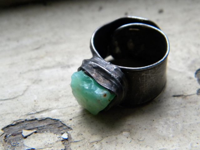 pierścionek.miedz,cyna i chryzopraz. obrączka o szerokosci 1,3cm. oczko1,4cm średnicy.Rozmiar regulowany, na zdjęciu ustawiony na rozmiar 15. Nabywce prosze o podanie rozmiaru ,lepiej żeby był ustawiony przeze mnie....