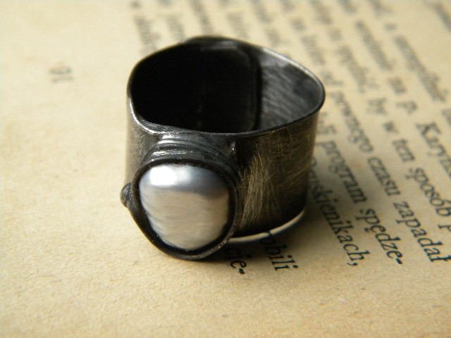 piescionek.miedz,cyna,perła.obraczka o szerokosci 1,4cm. rozmiar regulowany,jednak lepiej żeby był ustawiony przeze mnie... Nabywce prosze o podanie rozmiaru - tak jak jest ustawiony na zdjeciach to rozmiar ok 18-19
