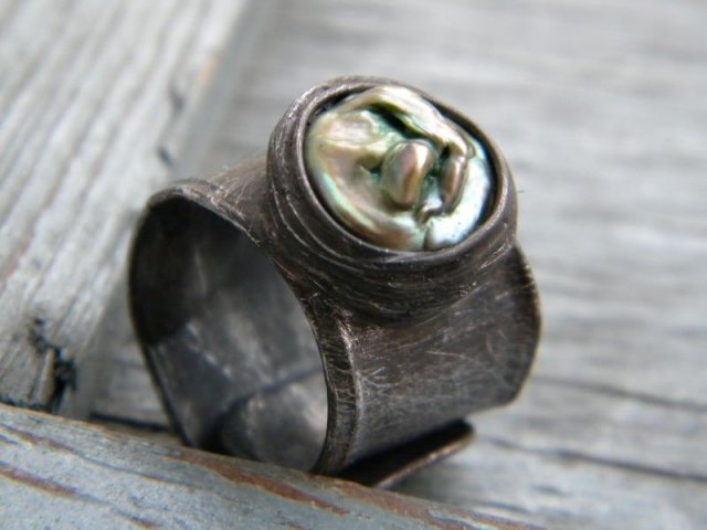 Pierścionek. perła w ocynowanej miedzi.obraczka o szerokosci 1,5cm. rozmiar regulowany,jednak lepiej żeby był ustawiony przeze mnie... Nabywce prosze o podanie rozmiaru - tak jak jest ustawiony na zdjęciach to rozmiar ok 14-15