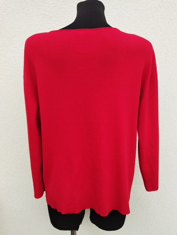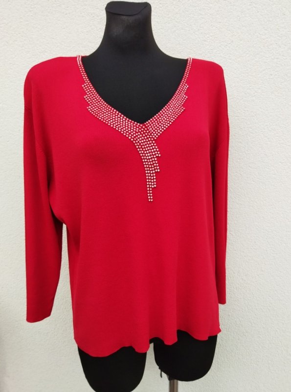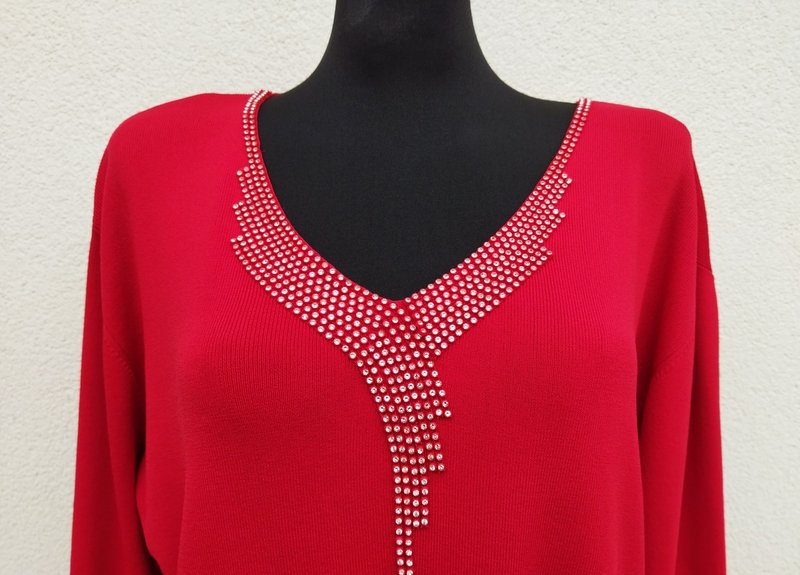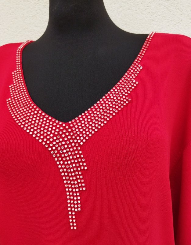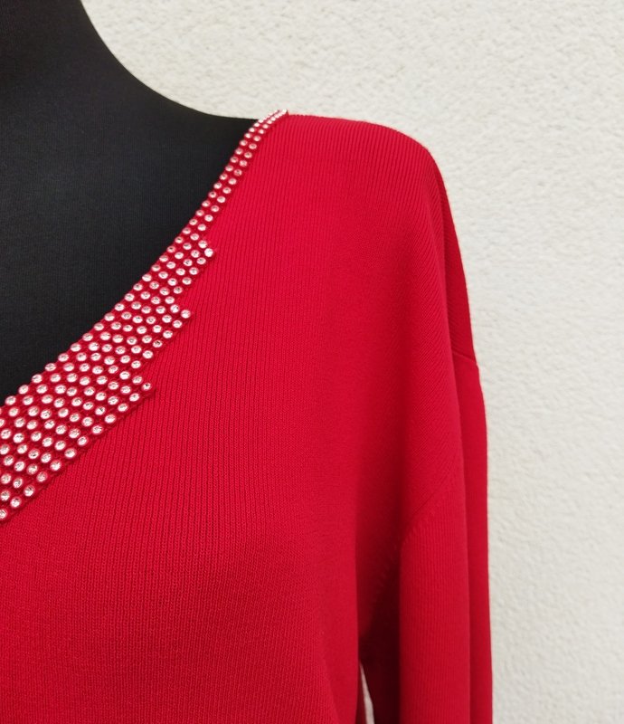 Elegancki wiskozowo-poliestrowy sweterek w kolorze nasyconej czerwieni. Dekolt w szpic z biżuteryjnym zdobieniem, rękawy 3/4.