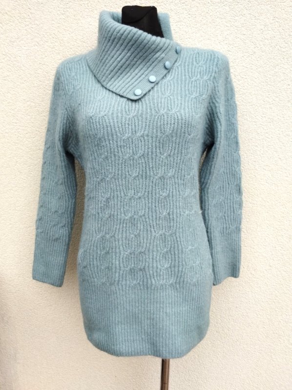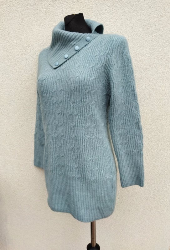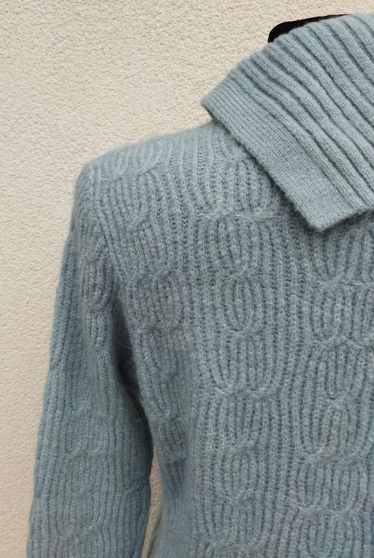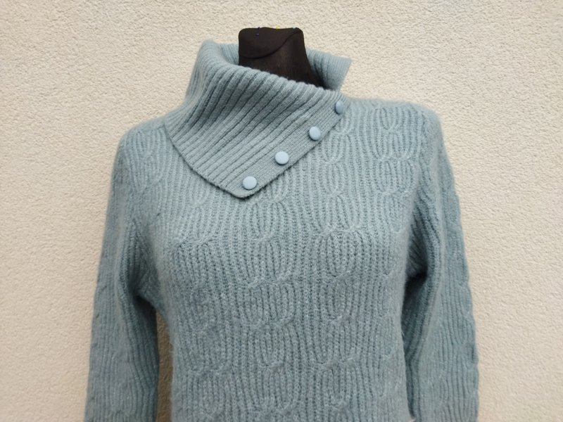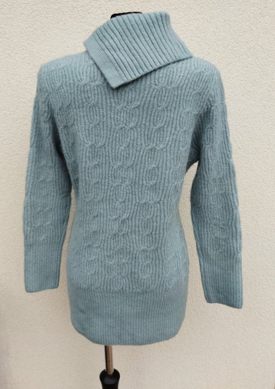 Miły, mięciutki sweter z akrylowej włóczki w miętowo-niebieskim kolorze z warkoczowym wzorem. Z golfem rozcinanym z jednej strony i naszywanymi guzikami. Wykończony ściągaczami.