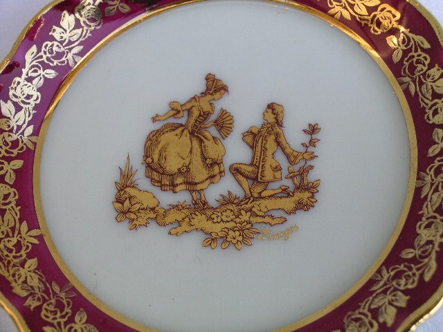 Klasycznie elegancki talerzyk biżuteryjno-dekoracyjny, sygnowany legendarną jakością Limoges. Bogactwo złocenia, precyzja malatury i elegancja spotkania kolorów :) Rant falbanowany, ryflowanie brzegu, złocenia. 9 x 1,5 cm. Stan zachowania bardzo dobry minus ślady lubego użytkowania :)